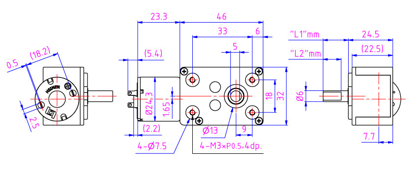 蝸桿蝸輪減速馬達透過蝸輪和蝸桿的嚙合,使出力軸的方向改變為垂直90度可達到運行平穩在表現上具備結構緊密尺寸小,輸出扭矩大、高承載力、重量輕、不易逆轉等優勢,祥能馬達HN2546G-HN250為46mm蝸桿蝸輪減速箱加上25mm直流馬達搭配使用,此型號適用電壓:3V-24V、提供齒輪箱多種減速比:170-900、馬達效率:66-73%。