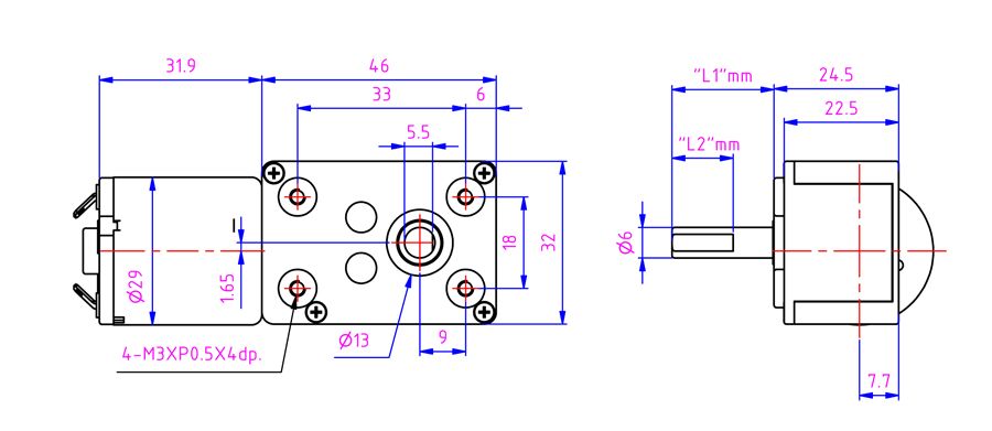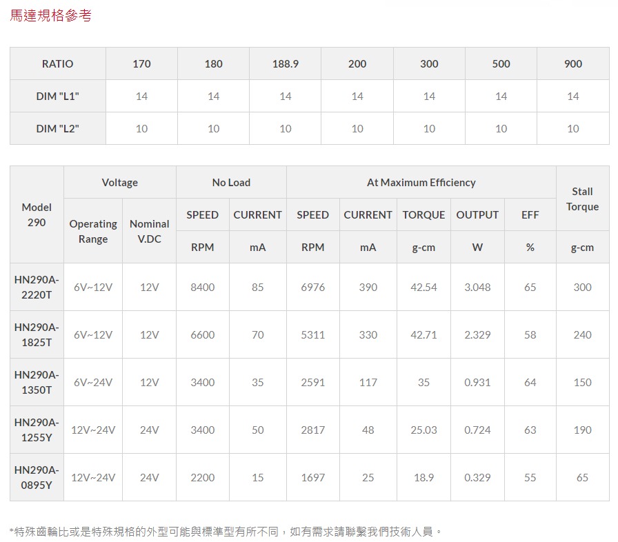 蝸桿蝸輪馬達 (Worm geared DC motor) 減速齒輪組包含蝸輪和蝸桿的結構,可依照產品需求來進行蝸輪或蝸桿的搭配以及客製,除了使用蝸輪和蝸桿組合以外祥能也提供不同的減速齒輪組合。透過蝸輪和蝸桿的設計可讓出力軸可以進行90度垂直的輸出,更具備輸出扭力大、高承載力、輕量化、不易逆轉等特點,祥能馬達HN2546G-HN290為46mm 蝸桿蝸輪減速箱加上29mm 直流馬達搭配使用,此型號適用電壓:6V-24V、提供齒輪箱多種減速比:170-900。 (特殊齒輪比或是特殊規格的外型可能與標準型有所不同,如有需求請聯繫我們技術人員)